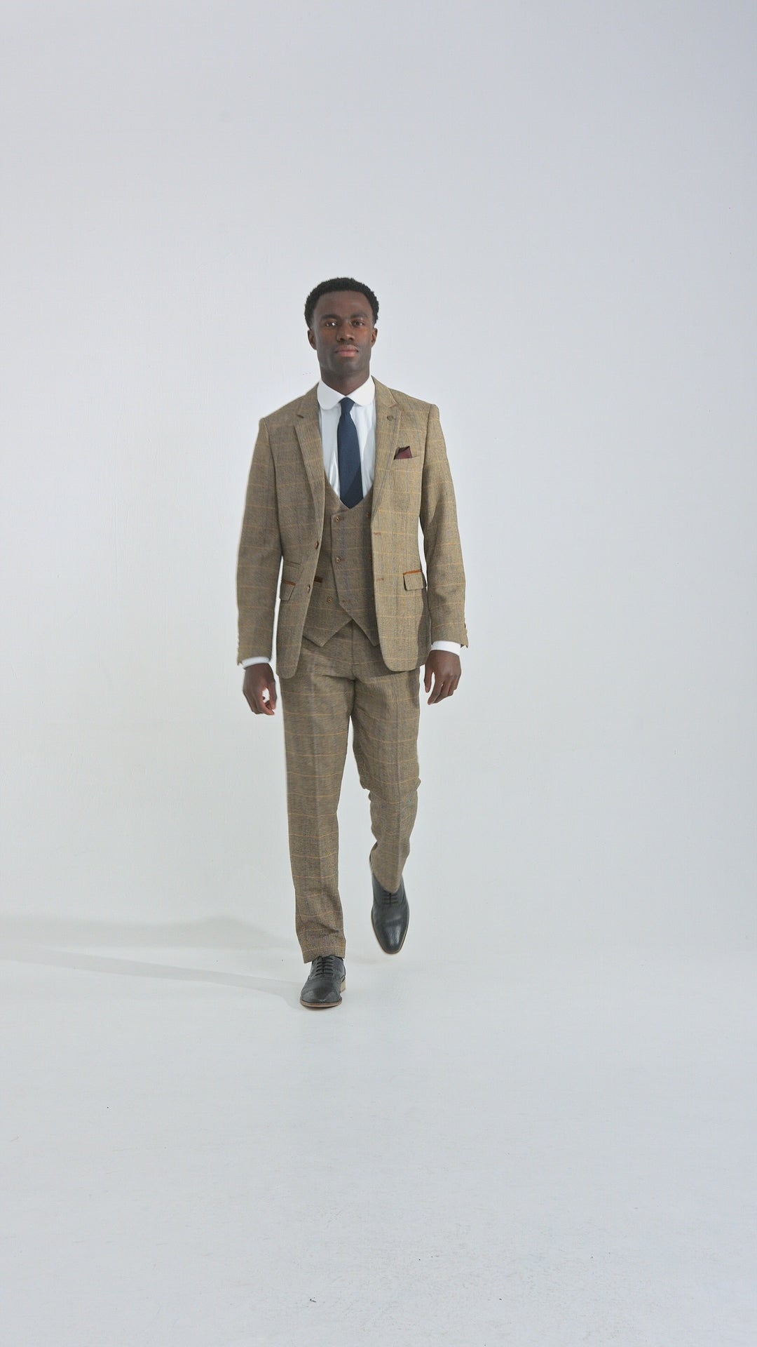 Moška 3-delna tvidasta obleka z vzorcem ribje kosti, svetlo rjava, karo, krojen kroj, dvojni klasičen kroj