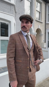 Moška tridelna obleka iz volnenega tvida, vzorec ribje kosti, rjava, modra, karo, Gatsby iz 20. let 20. stoletja